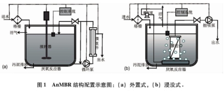 AnMBR的膜组件主要是超滤和微滤膜,在膜组件的配置上主要有两种形式,即外置式和浸没式。